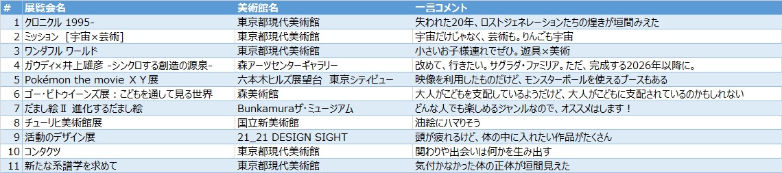 美術館などの展覧会に頻繁に行くようになりました。元々嫌いじゃない何かを見て考える事の幅を広げようと思ったのがきっかけ。1年間で見に行ったのはこんな感じ。