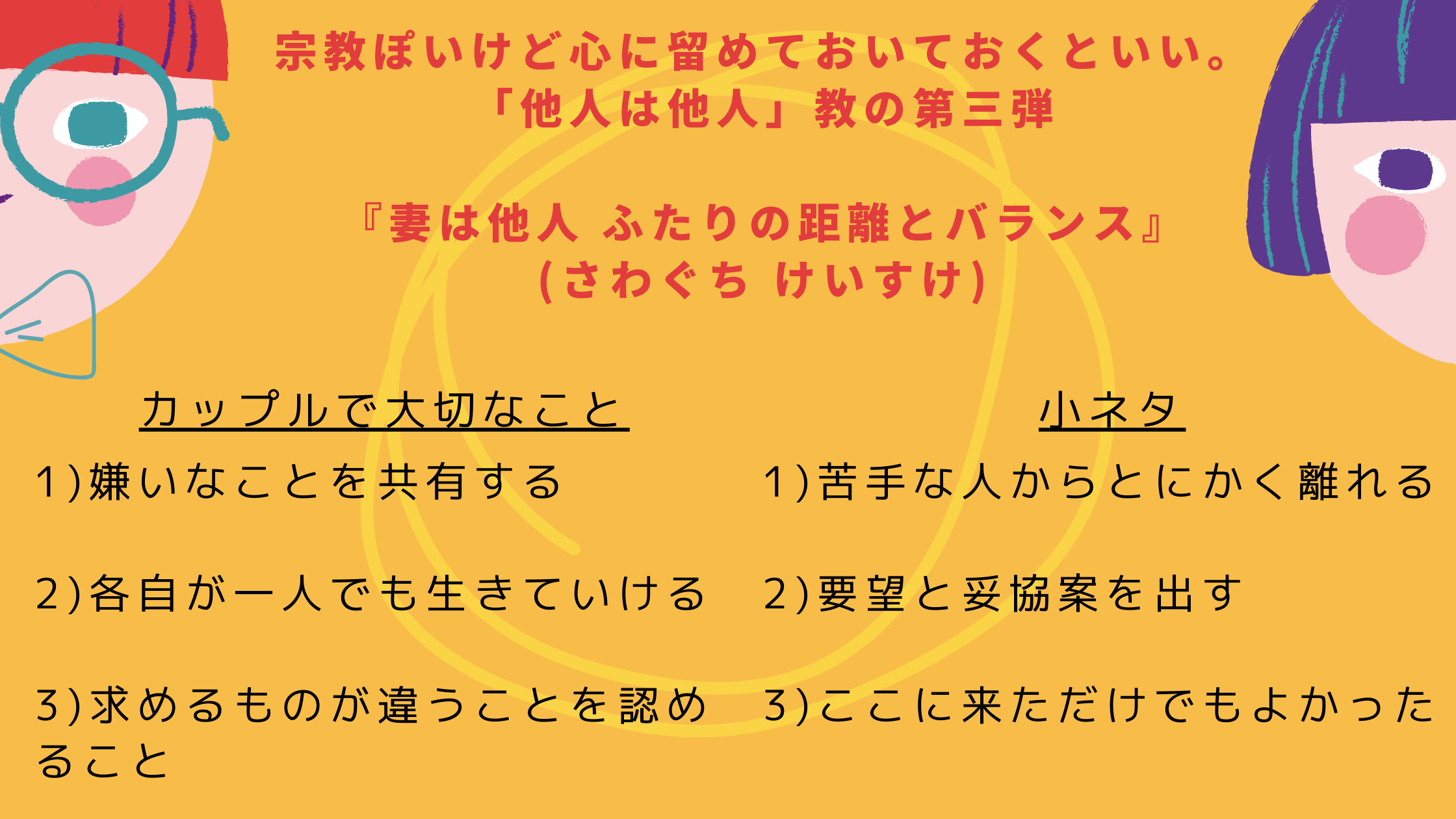 夫婦の関係だけでなく、恋人であったり仕事上の関係性で悩みを抱えている人がいたときにそんな考え方をすれば少しは楽になるかもしれないと思える思考回路のヒントになる。この人の「他人」シリーズ(勝手にそう呼んでいますが)の基本的な考え方はずっと変わっていない中で人が二人いた時の考え方のするすり合わせの方法が深まっている。